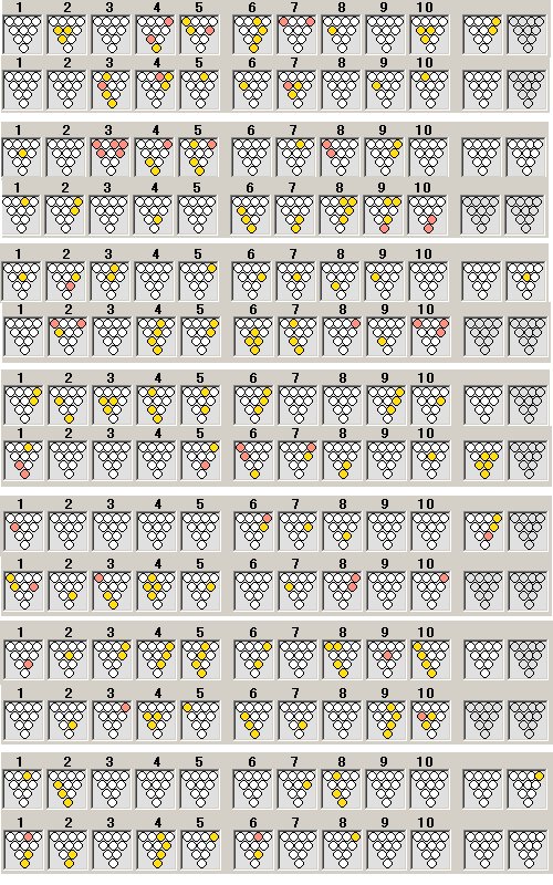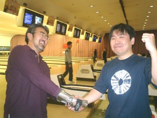 | さすがに両者とも試合巧者のアベレージボウラー。第1ゲーム早々からマークを重ねる展開。しかし白木は中盤にピンに嫌われたかのようにスプリットを続出。その間丁寧にマークを重ねた松本誠が緒戦を取った。 第2ゲームも初戦のカーボンコピーのような展開。これも僅差で松本誠が取った。 第3ゲームは、まったく逆の展開。松本誠がスプリット禍に見舞われる一方で球道が安定してきた白木が確実にマーク、最後まで気を抜かずに192点でこのゲームを取り、1ゲーム差に戻した。 ナビスコカップを挟んで後半戦がスタート。 第4ゲームでは松本誠が序盤にターキーを取ったもののその後自滅の展開。白木は序盤こそボールが左右にぶれたが、中盤から立て直し、フルマークで193。これまた大差で松本誠を下し、2勝2敗のタイに持ち込んだ。 この時点で完全に勢いの流れは変わった。そして第5ゲームでは白木が大爆発。序盤のフォースに終盤のダブルと効果的にストライクを重ね200upと完全勝利。松本誠ができることは体力温存のみといった状態だった。 第6ゲームでは、お互いにストライクが2つずつとアベレージボウラーらしい勝負となった。これは松本誠が僅差で交わした。これで3勝3敗となり勝負は最終7ゲームにもつれ込んだ。 最後の第7戦は、またも白木が大爆発。序盤のフォースに終盤のターキーで242点。これは千里シリーズ最高得点となるすばらしいスコア。松本誠も最後にフォースを出し、意地を見せたが焼け石に水、2度目の千里シリーズ敗退。 以上、第7戦までもつれ込む接戦となったが、僅差での駆け引きに持ち込みたかった松本誠を白木の爆発力がねじ伏せた形となった。白木のシリーズ制覇はこれで3度目。アベレージ188はシリーズ2位の記録。 |